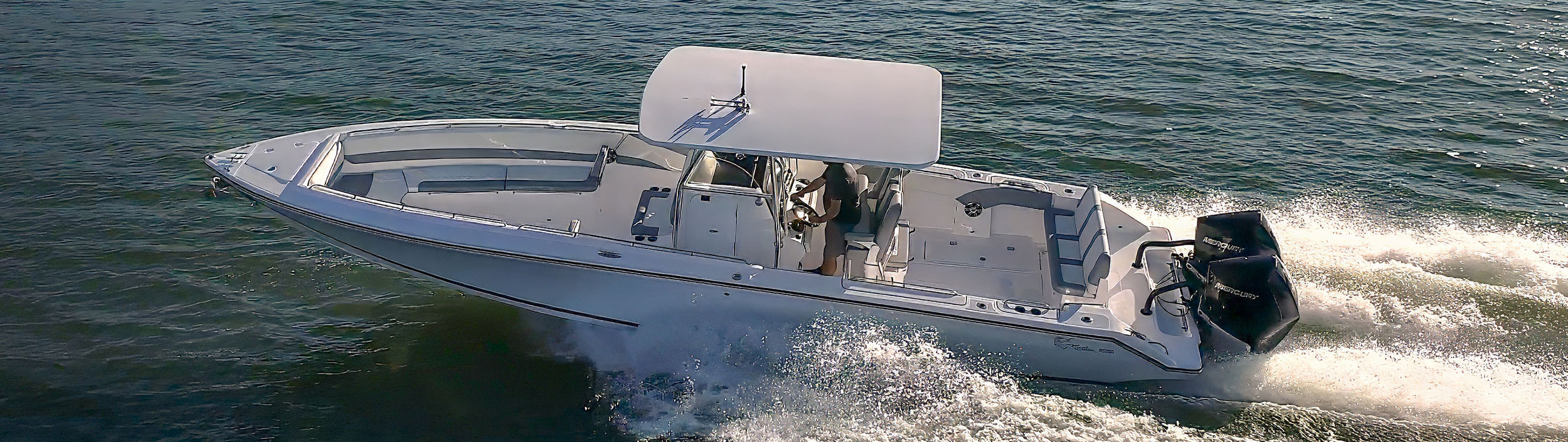 Passengers can feel secure and will be in total comfort with the plush helm seat with flip-up bolster, adjustable arm rest and ergonomic dual combination footrest. Standard fiberglass T-Top with aluminum frame and aluminum helm seat base with slide out Yetti cooler.