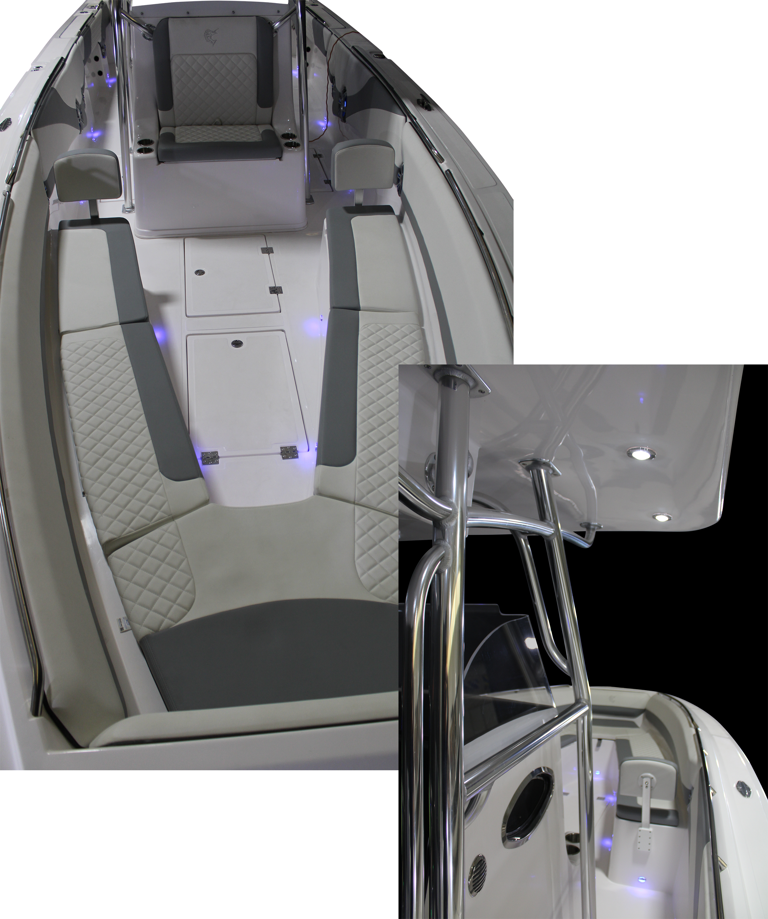 In command at Marlago’s helm you will find everything at your fingertips from the dual flush mounted Garmin chartplotters, Mercury controls and full instrumentation. Vessels systems including battery control and monitoring are easily commanded by captain or co-pilot at the helm, additionally the helm integrates cup holders, glove box and cell phone charging station.