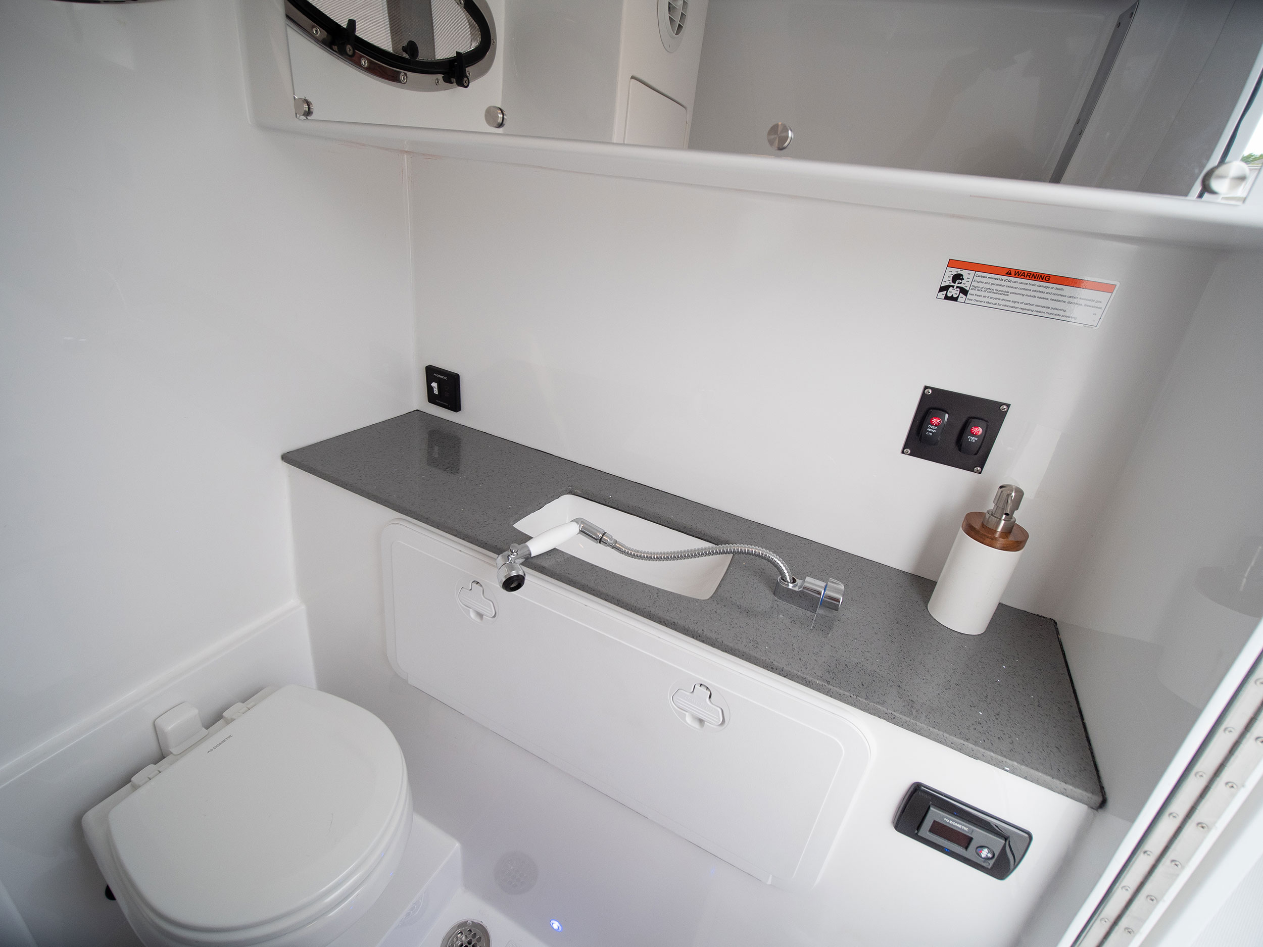 Marlago’s head compartment offers a vacu-flush head, sink, and plenty of storage space.